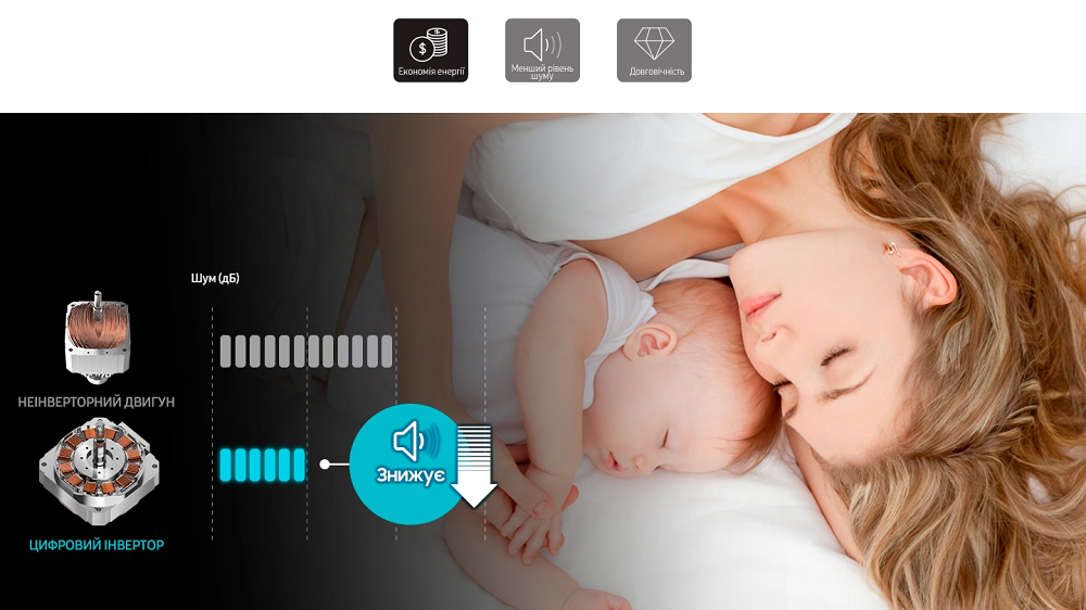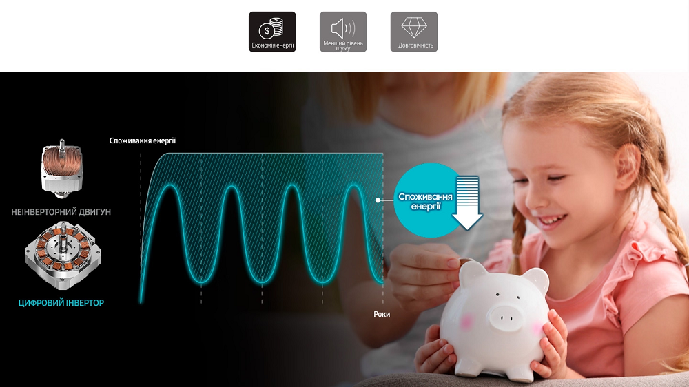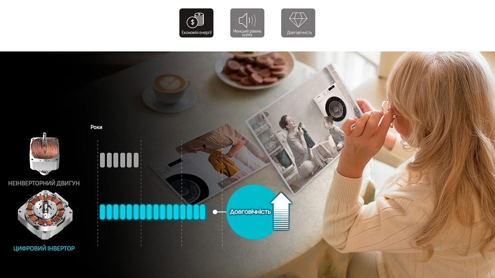 Щасливі дні прання. Ось тиха пральна машина, яка розрахована на довгий термін служби, має всю необхідну потужність, знижує рівень шуму та при цьому споживає менше енергії ніж звичайна пральна машина, тому вона також дбайливіше ставиться до вашого гаманця. Це все завдяки нашій технології цифрового інвертора, яка збільшує продуктивність, а не шум.