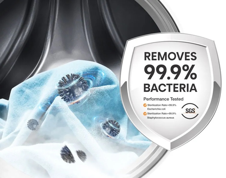 Високотемпературна пара випускається з нижньої частини барабана та повністю проникає в білизну, знищуючи 99,9%* кишкової палички та золотистого стафілокока на одязі.