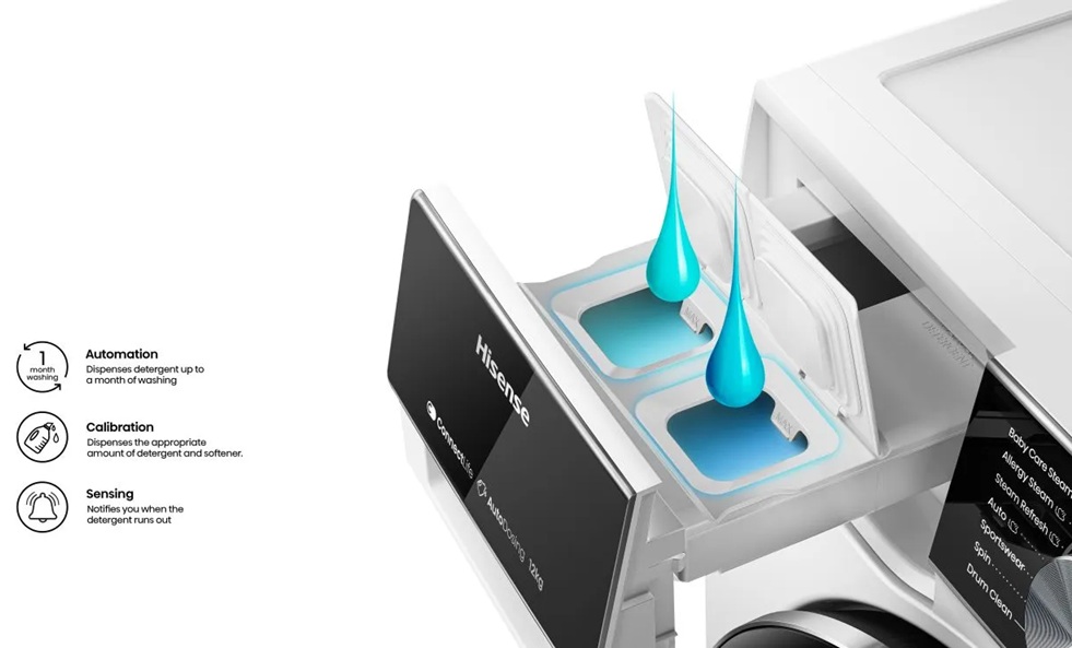 Пральна машина автоматично вибирає точне дозування прального засобу або пом’якшувача відповідно до ваги білизни. Крім того, ця машина може зберігати одночасно до 24 завантажень засобу — це означає близько місяця без повторного завантаження*.