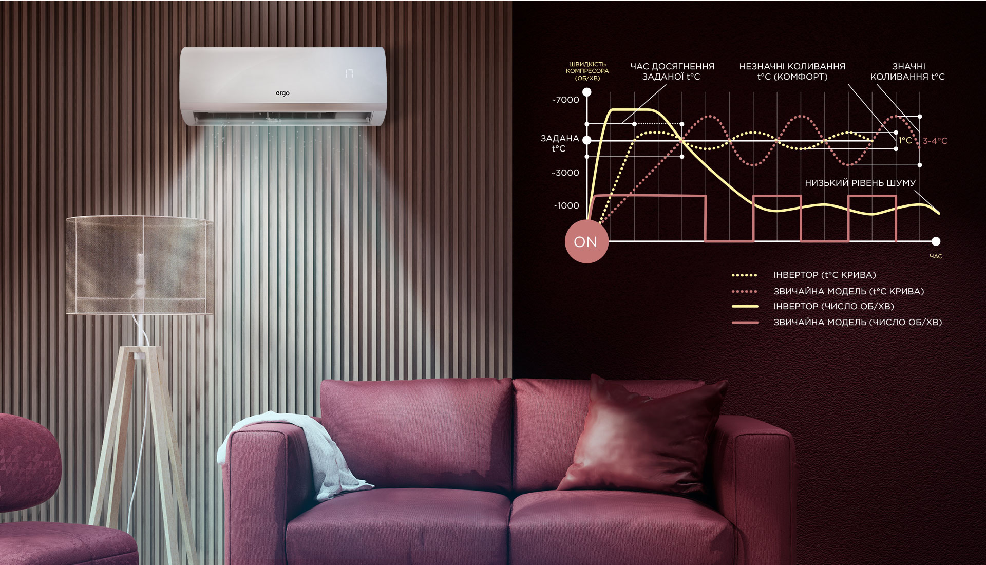 Інверторна технологія керування компресором кондиціонера забезпечує більш гнучку та точну підтримку температури порівняно з кондиціонерами з постійною частотою обертання компресора (On/Off-типу). Тож такі кондиціонери більш енергоефективні, працюють у ширшому діапазоні зовнішніх температур, за відсутністю постійних режимів запуску, мають нижчий рівень шуму.