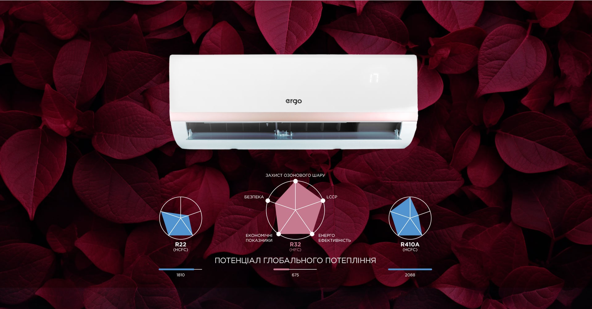 Холодоагент R32 більш екологічний: R32 має на 65% менший ПГП (потенціал глобального потепління), ніж R410A; і ефективніший: R32 має на 30% меншу щільність, ніж R410A, а тому його витрати менші при однакових показниках потужності.