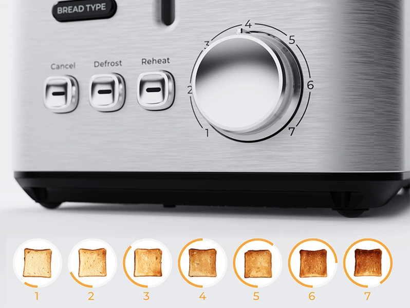 Від ніжно золотистої до насичено хрусткої скоринки — обирайте серед 7 точних налаштувань, щоб щоразу отримувати саме той результат, який любите. Для сніданкових тостів, сендвічів або перекусів — насолоджуйтесь стабільною якістю й індивідуальним підсмажуванням без зайвих зусиль