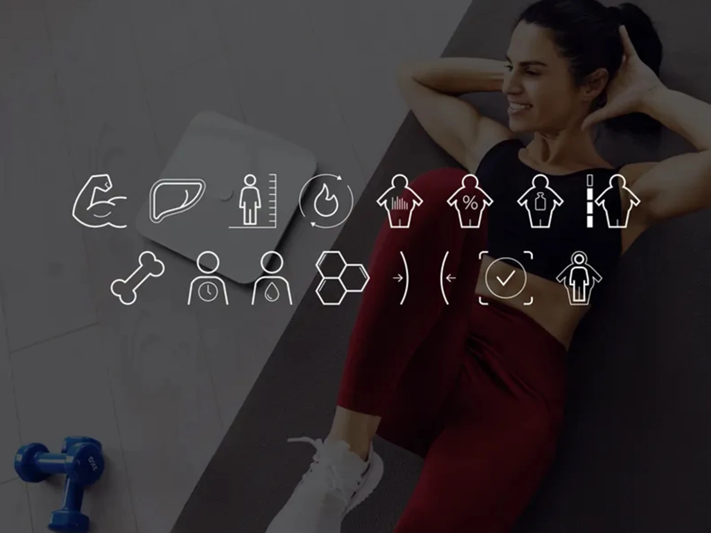 М'язова маса, індекс вісцерального жиру, ІМТ (індекс маси тіла), БМР (базальна швидкість метаболізму), норма жиру в організмі, індекс жиру в організмі, маса жиру в організмі, рівень ожиріння, кісткова маса, метаболічний вік, вода в організмі, норма білка, контроль ваги, ідеальна вага, вага без жиру