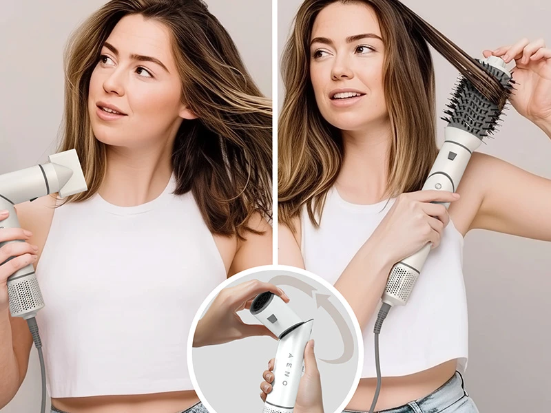 AENO Hair Styler & Dryer HS1 має унікальний механізм повороту, який без зусиль перетворює пристрій з високопродуктивного фена на універсальний інструмент для укладання. Ця інноваційна конструкція дозволяє швидко переключатися між режимами сушіння та укладання, що робить його ідеальним для швидкої та безперебійної процедури укладання.